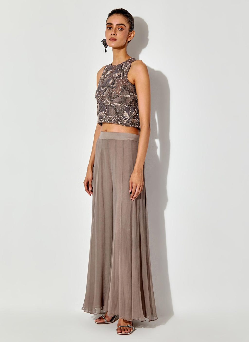 Grey Embroidred Halter Top In Silk Organza Paired With Chiffon Sharara Pants