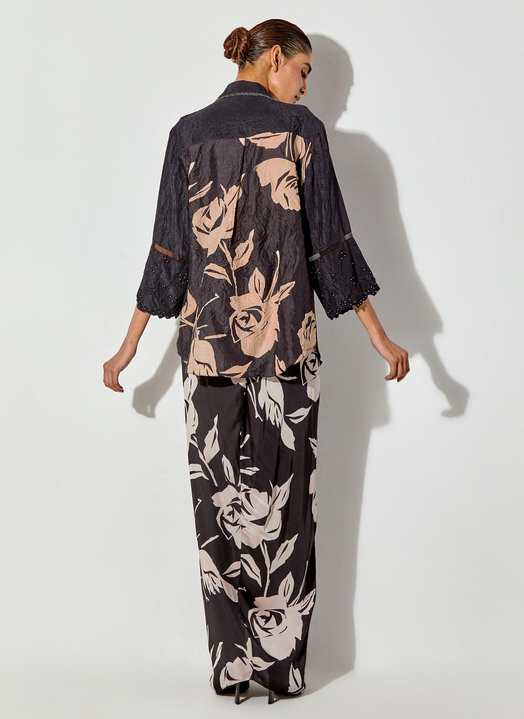 Black Silk Shirt And Fully Embroiderd Organza Gilet Paired With Draped Maxi Skirt With Embroidered Detailing On Waist
