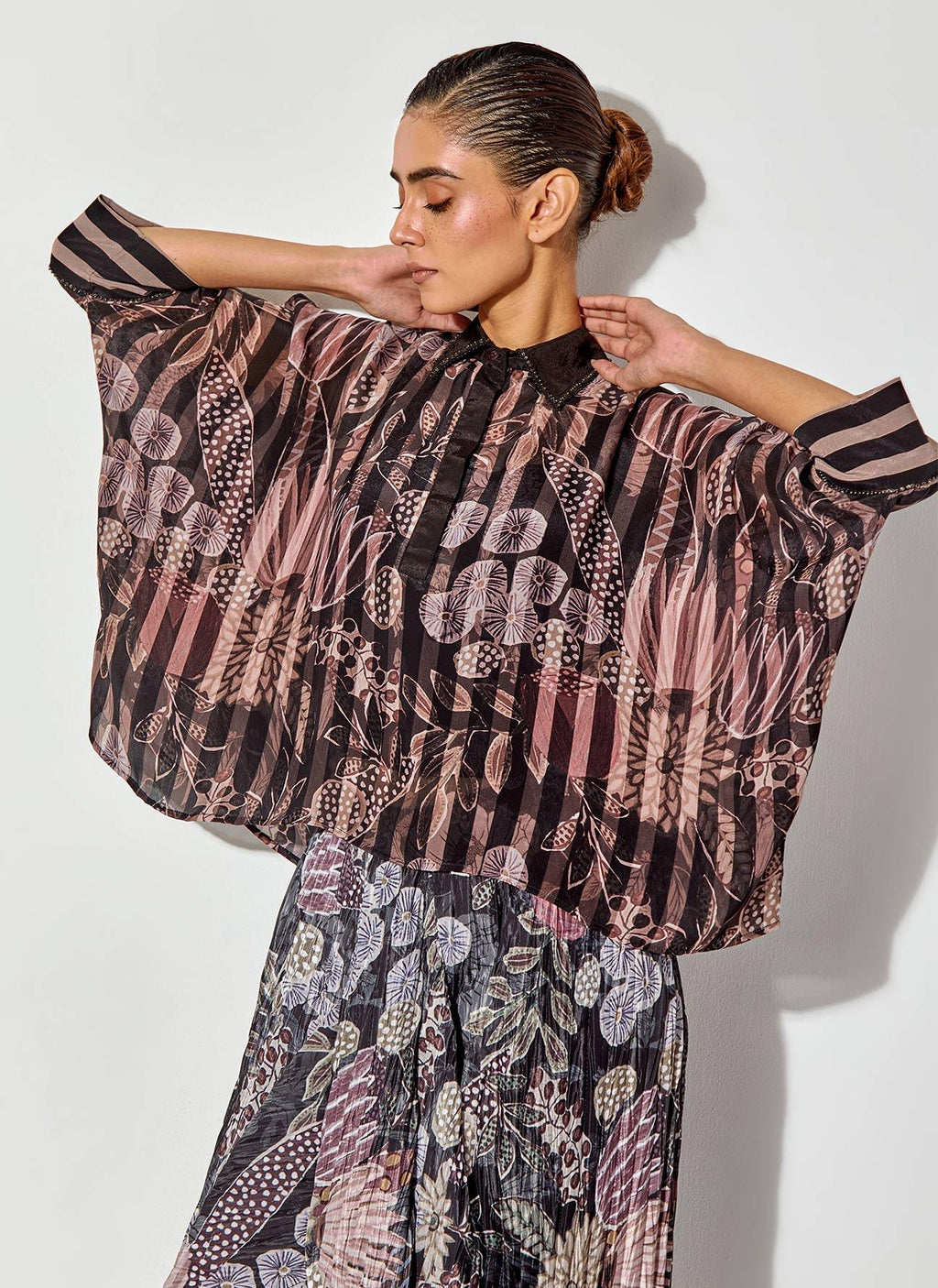 Multicolor Gypsy Rose Crepe Shirt Paired With Pleated Crinkle Drape Skirt
