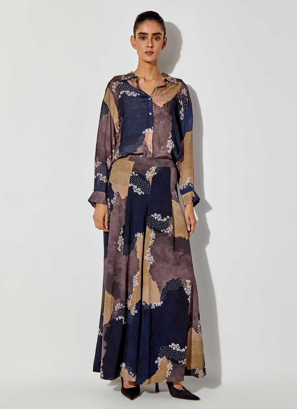 • Printed Shirt With Embroidered Collar Paired With Crepe Panelled Pants