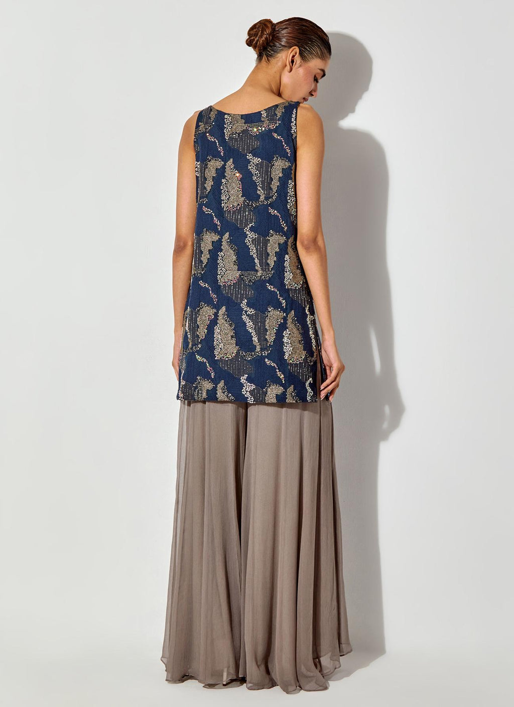 Blue/ Grey Embroidered Sleeveless Tunic Paired With Chiffon Sharara Pants