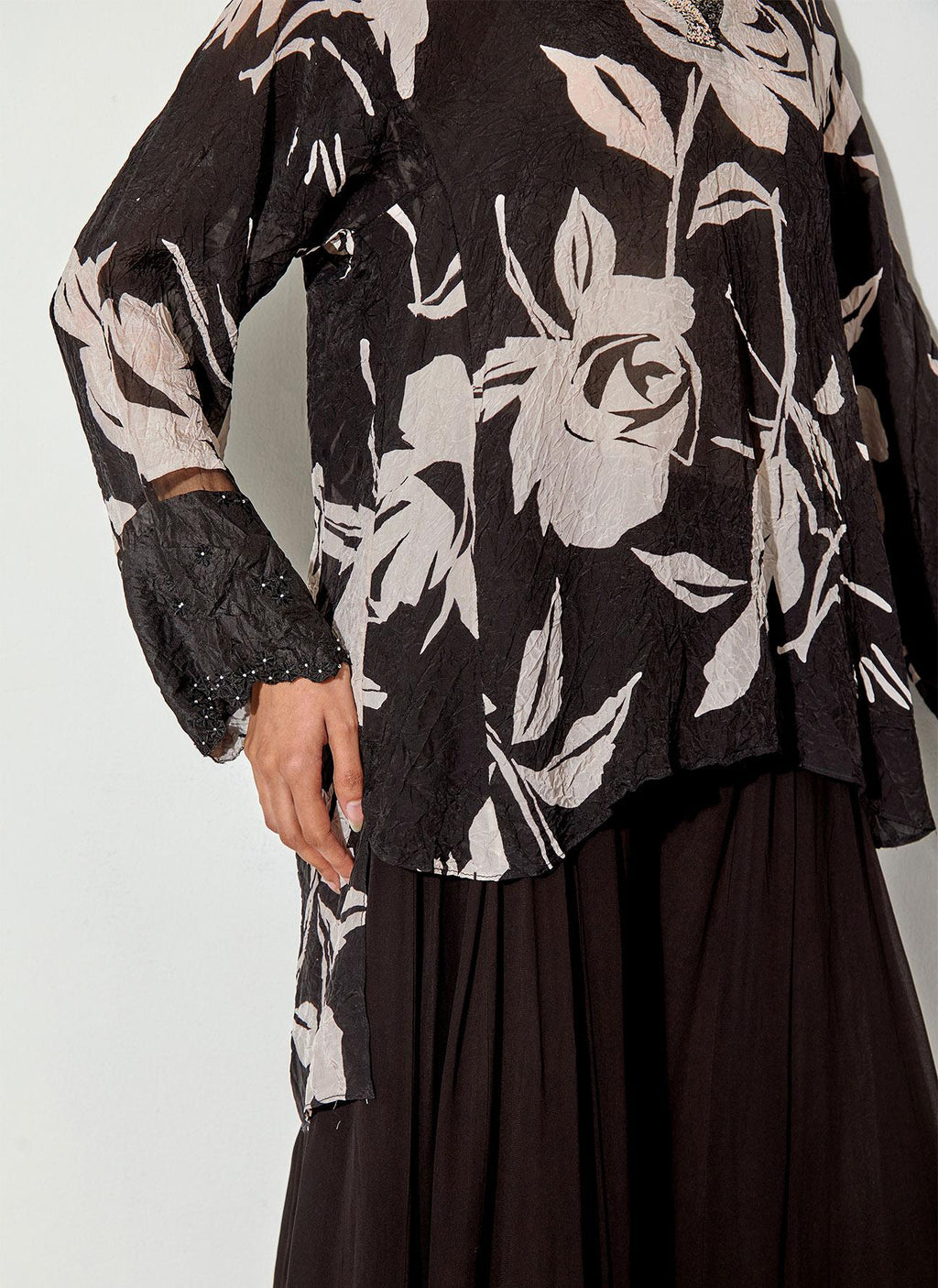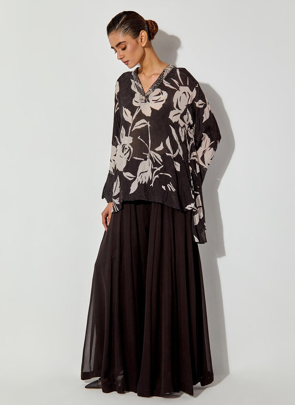 Black Silk Printed Shirt With Neck And Cuff Detailing Paired With Georgette Panelled Sharara Pants