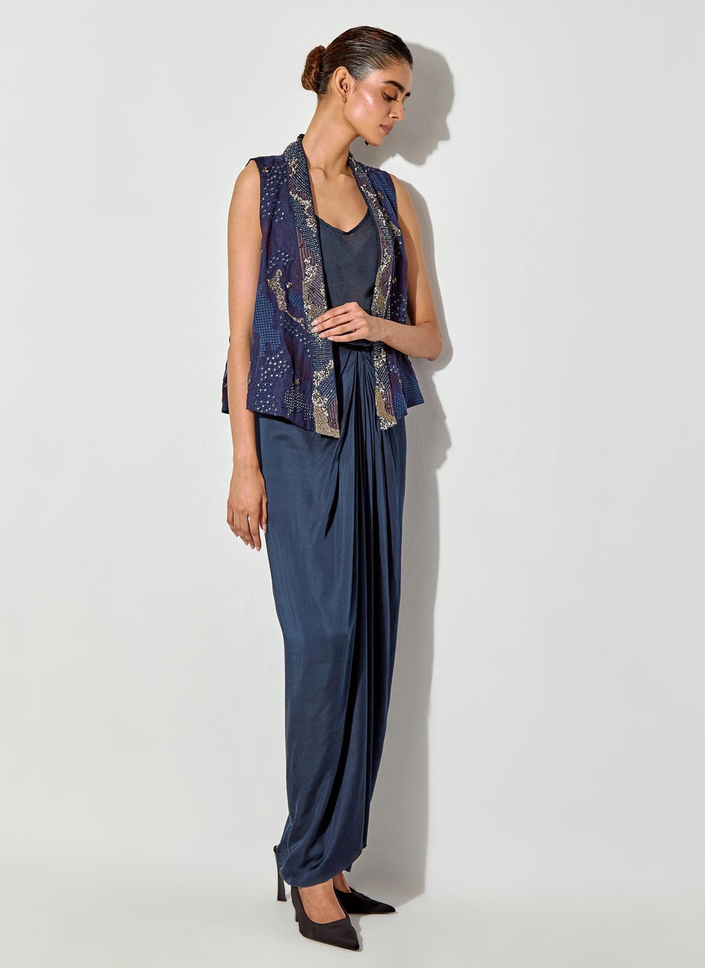Blue Embroidered Gilet Paired With Crepe Inner And Satin Drape Skirt