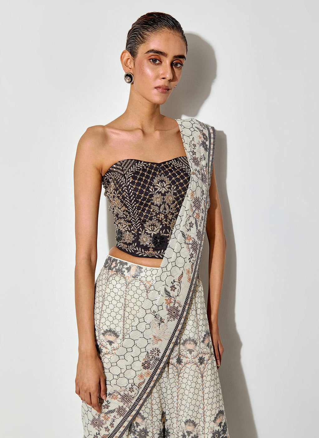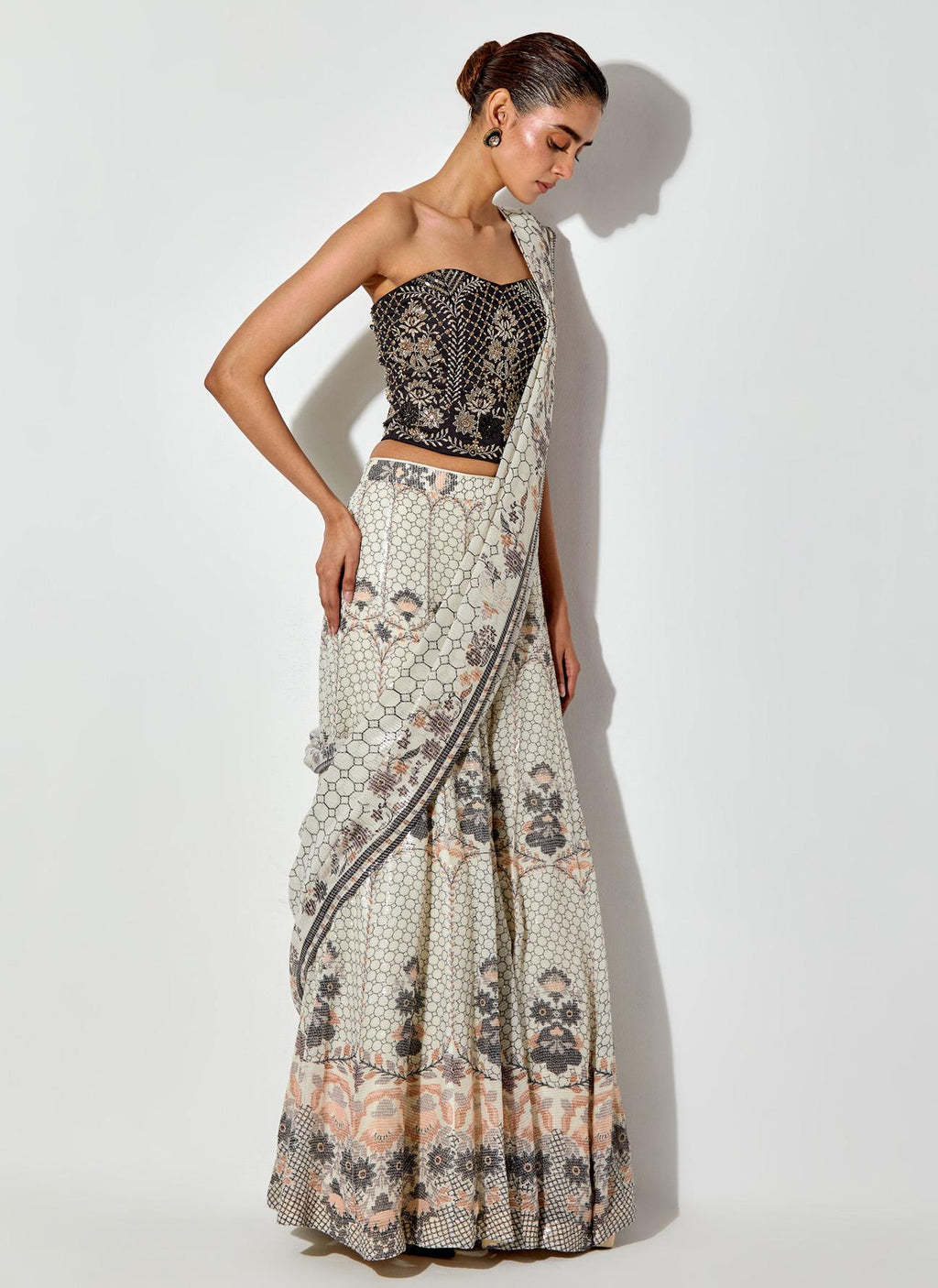 • Printed And Sequin Embroidred Tiered Drape Lehenga Saree Paired With Hand Embellished Corset Blouse
