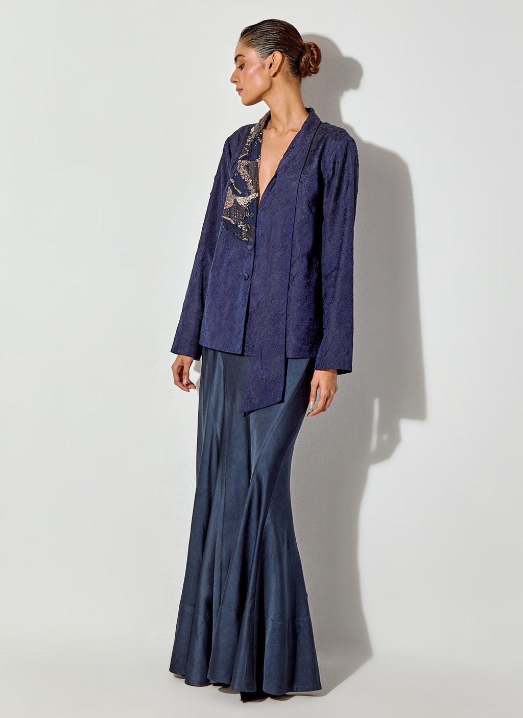 • Crush Silk Blazer With Embroided Lapel Paired With Satin Panelled Skirt