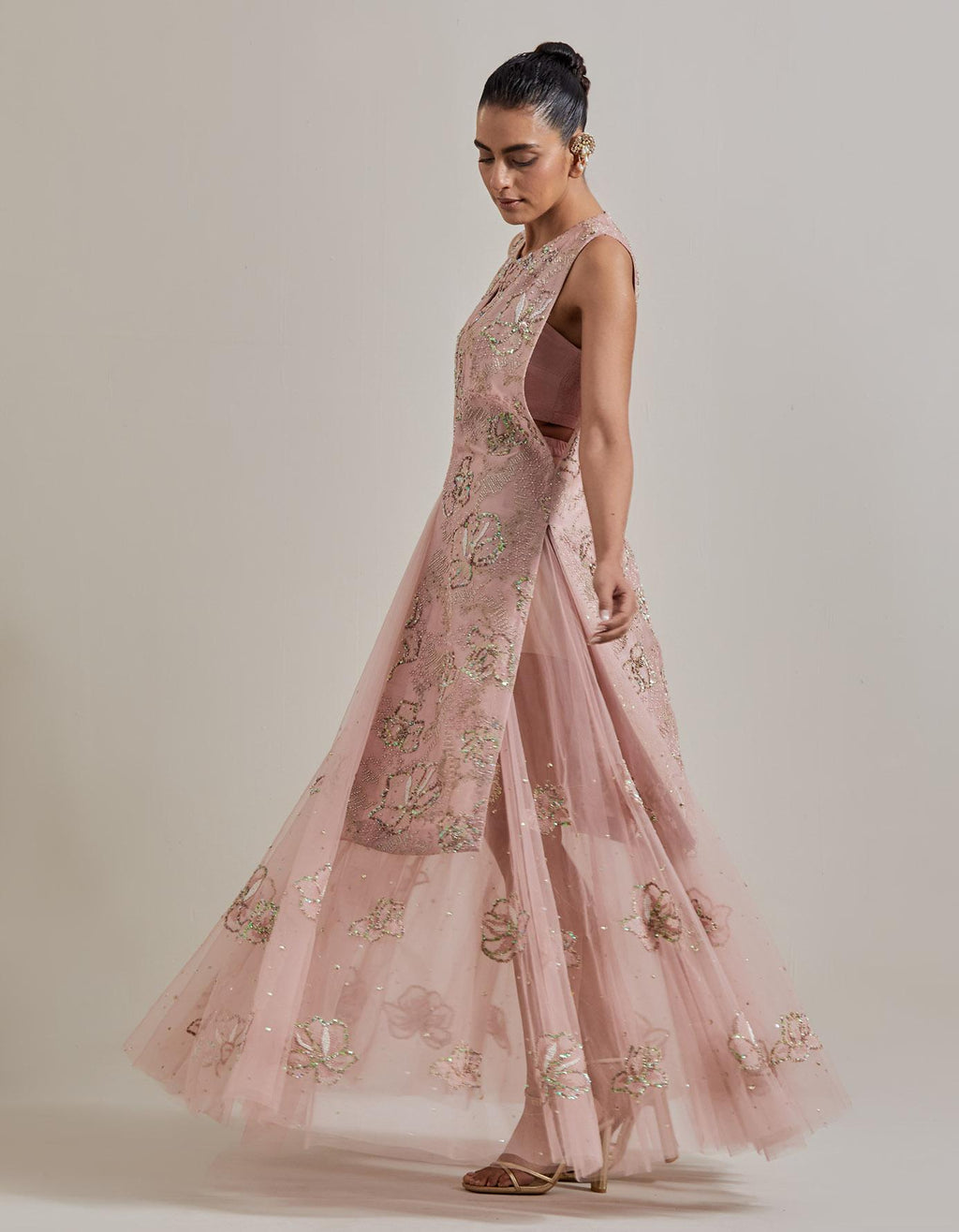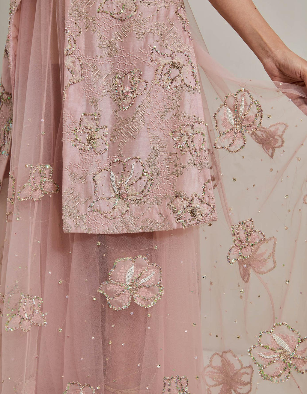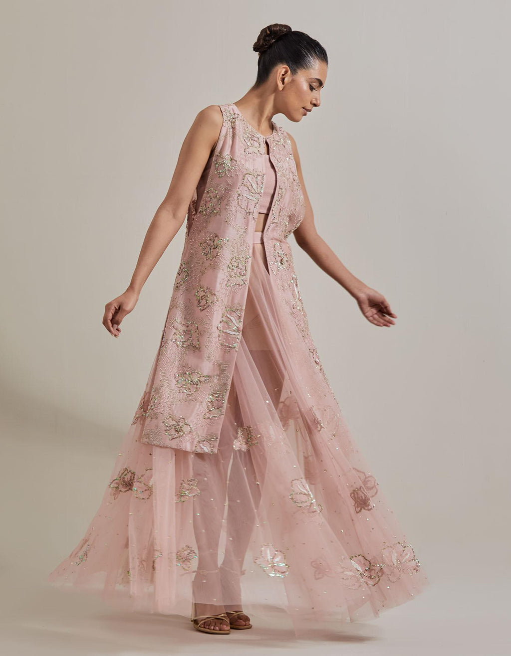 Pink Water Glimmer Long Jacket Paired With Mesh Circular Skirt And Inner
