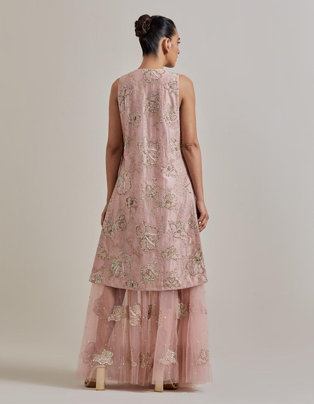 • Pink Water Glimmer Long Jacket Paired With Mesh Circular Skirt And Inner