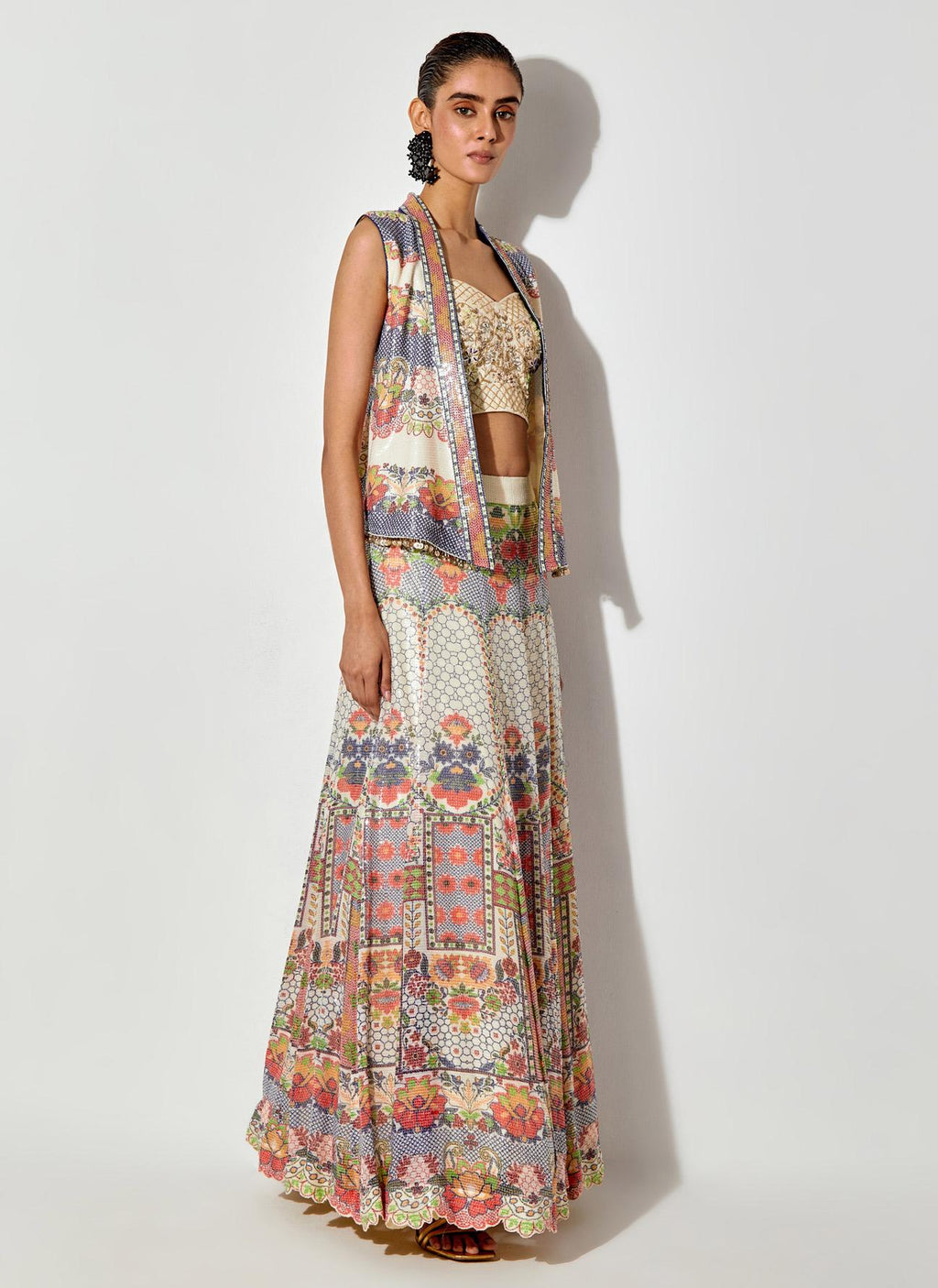 Off White Hand Embellished Bustier Paired With Printed And Sequin Embroidered Gilet And Skirt