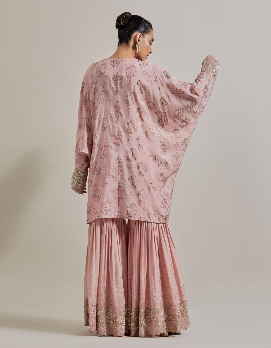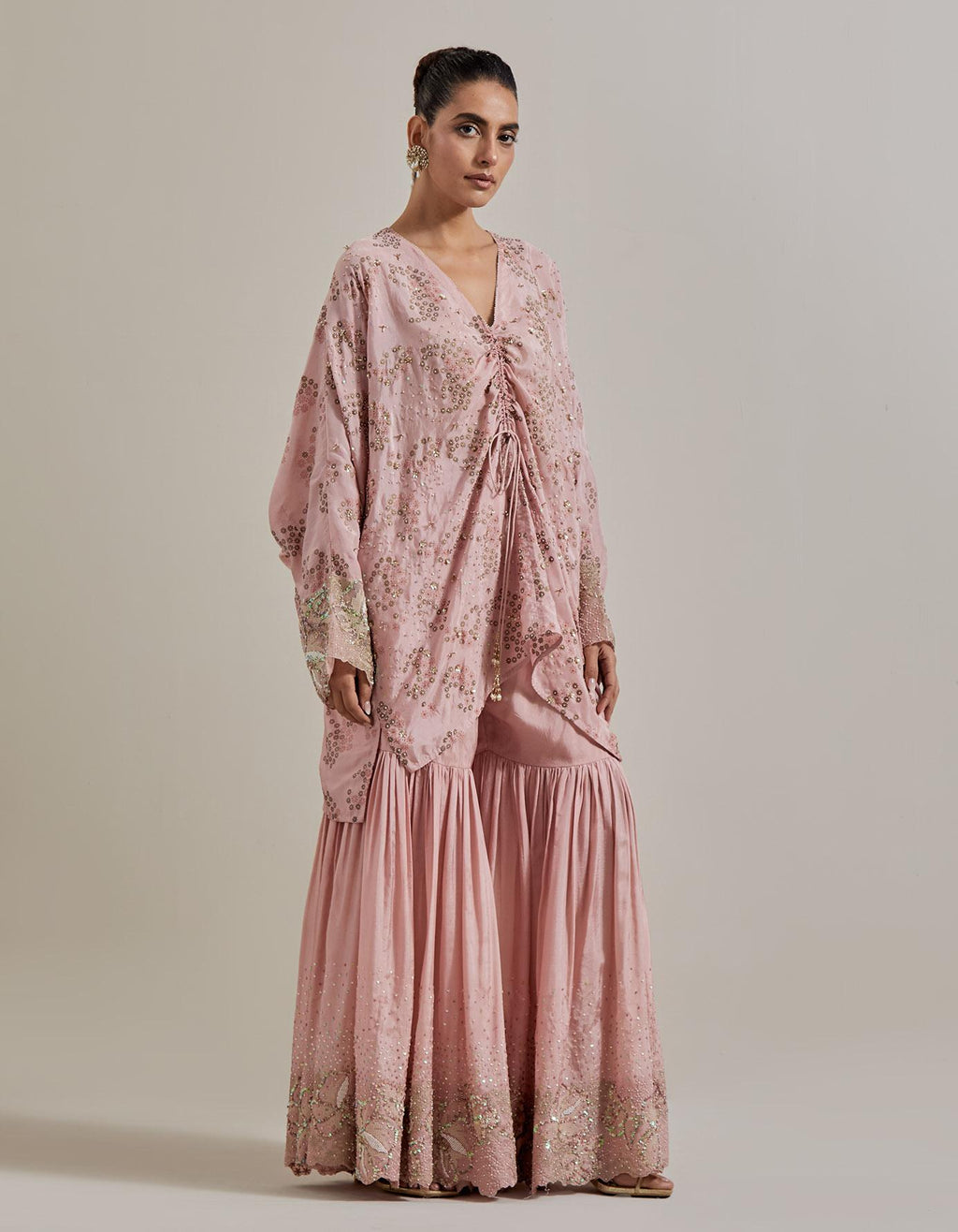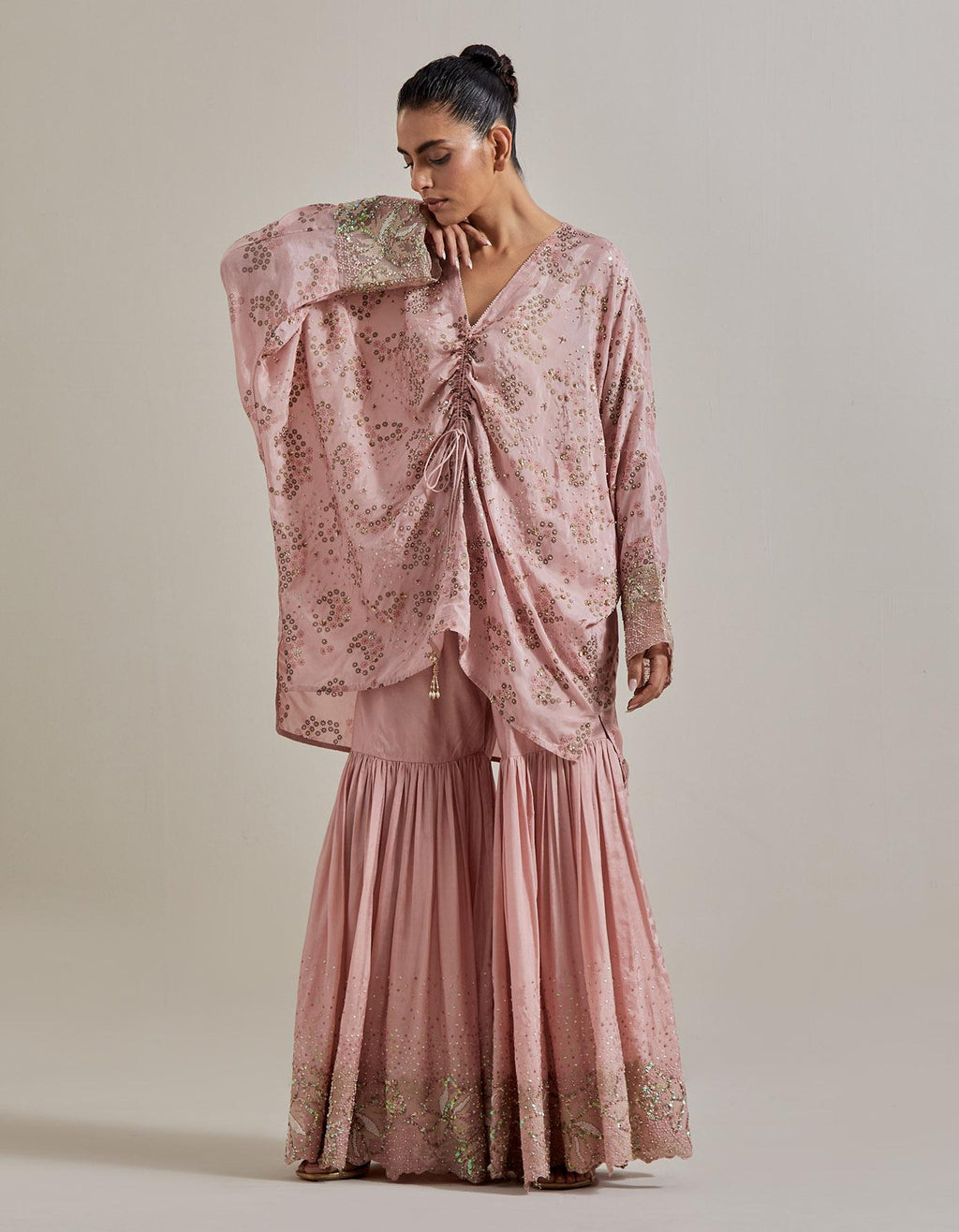 Pink Water Glimmer Silk Kaftan Tunic Paired With Embellished Gharara