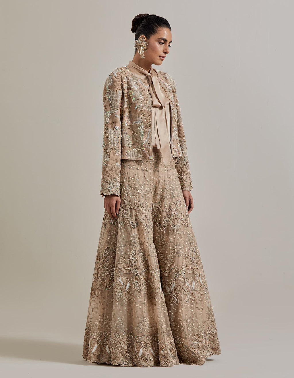 • Champagne Pink Water Glimmer Sharara Pants Paired With Satin Shirt And Embellished Jacket