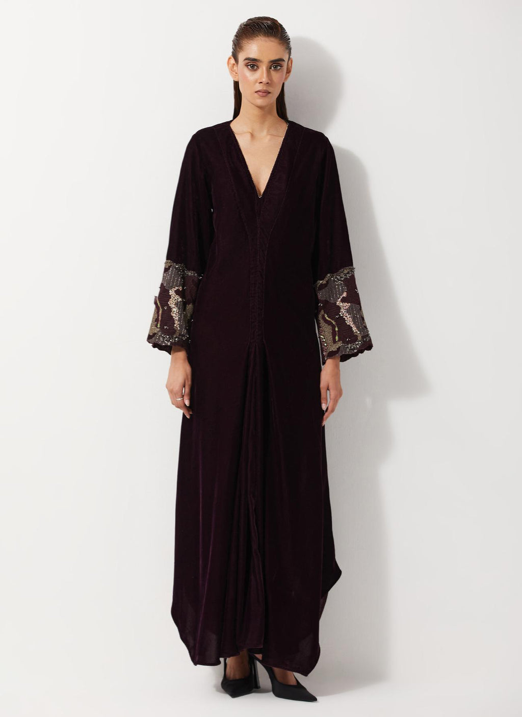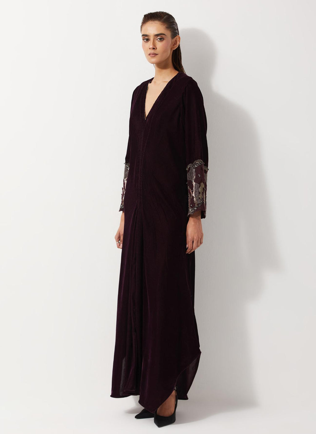 Burgandy Velvet Dress With Pleated Details And Sequin Embroidered Cuffs