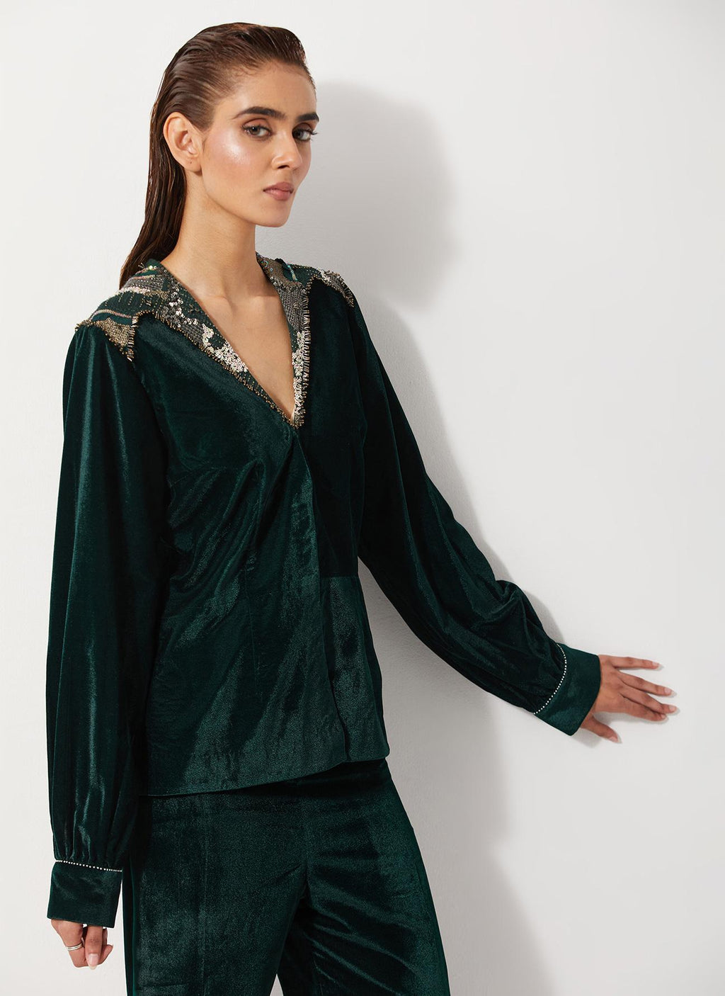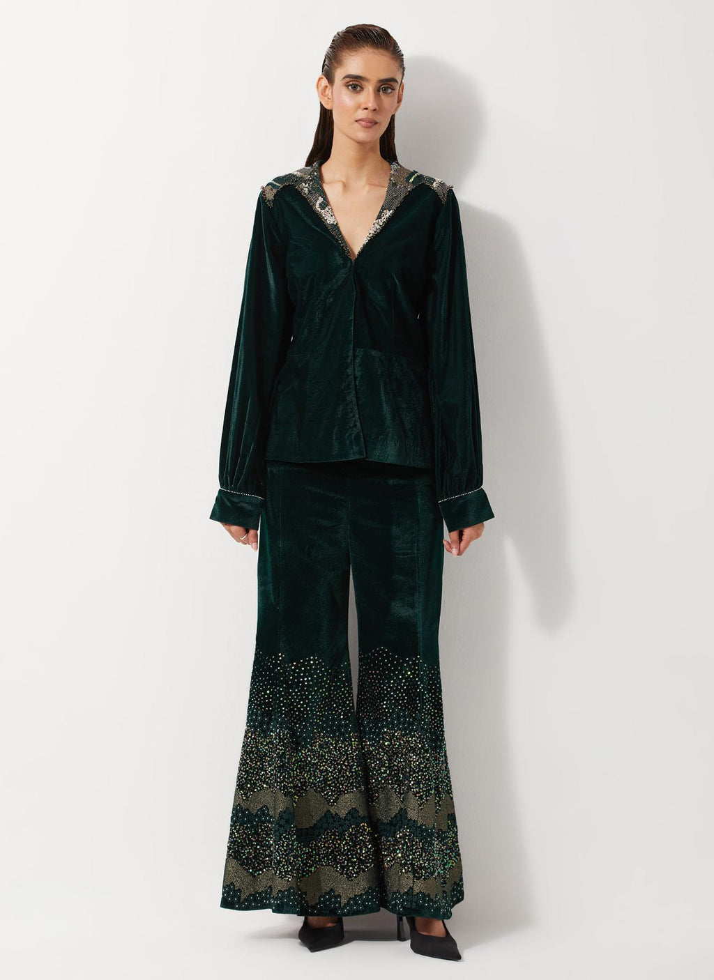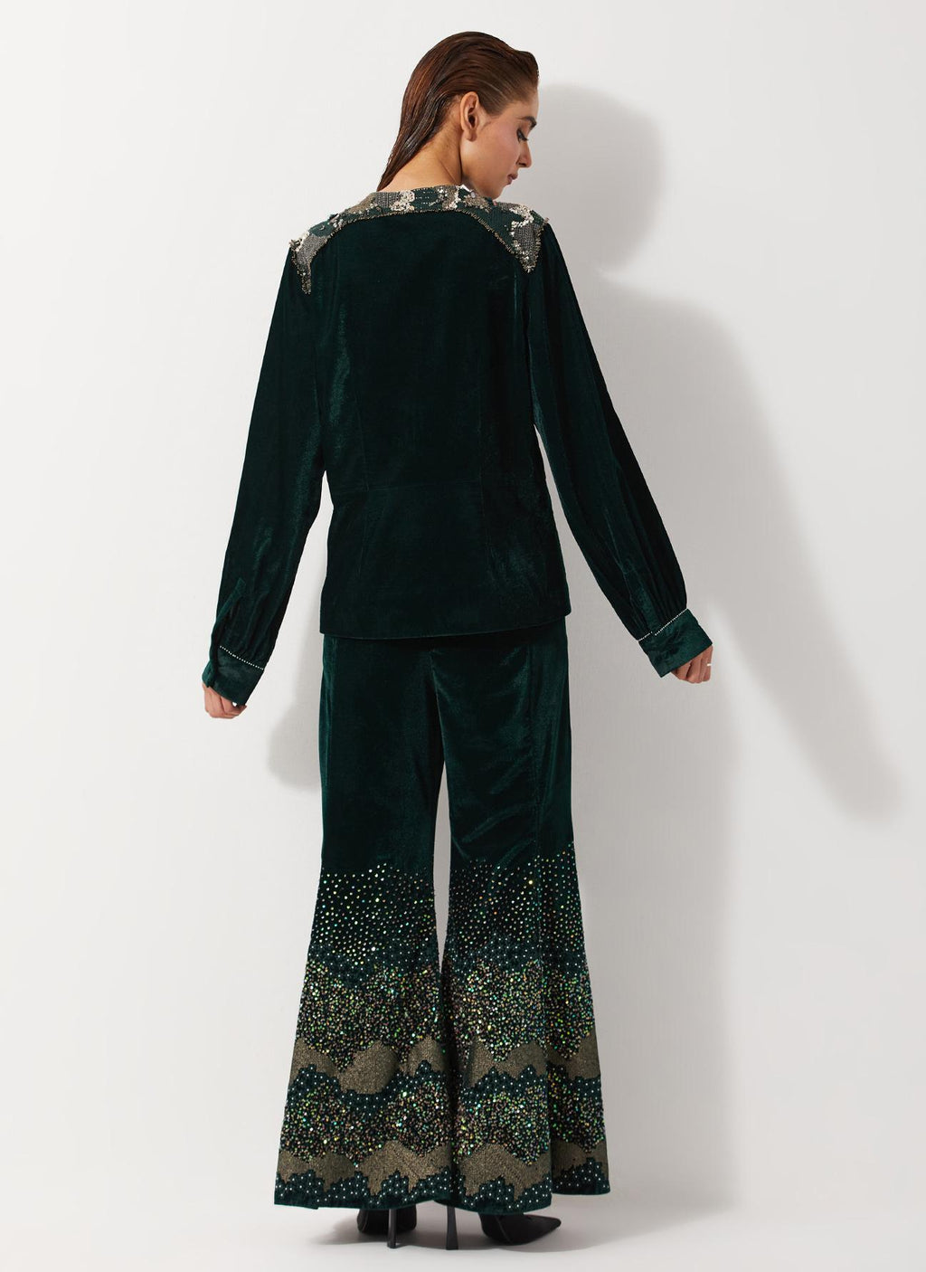 Bottle Green Peplum Velvet Jacket Paired With Flared Embroidery Trouser