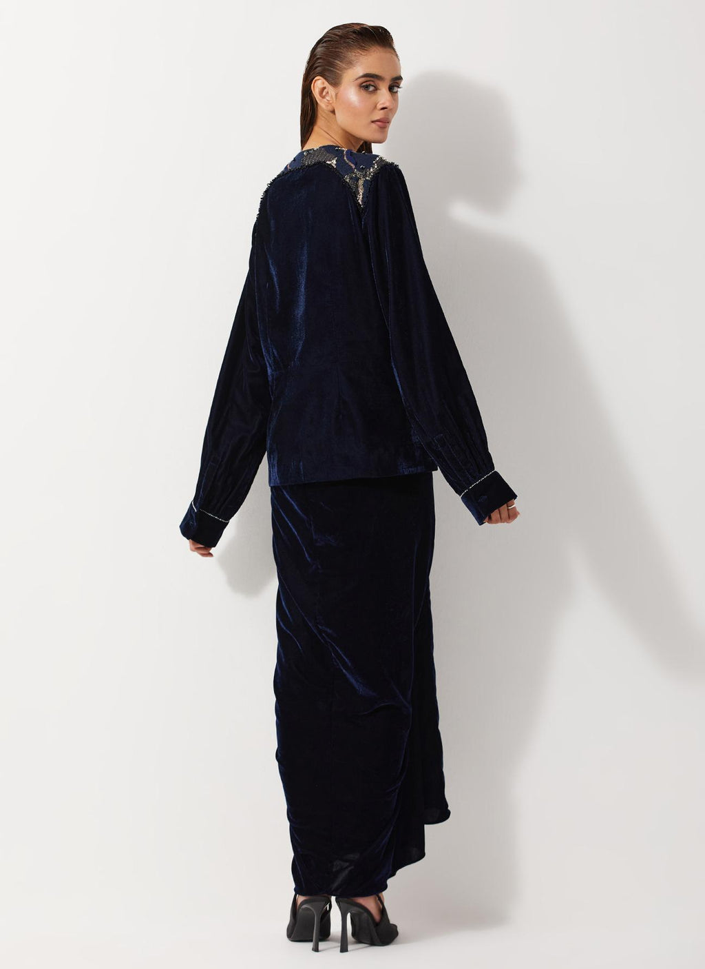 Navy Blue Peplum Velvet Jacket Paired With Velvet Cowl Skirt