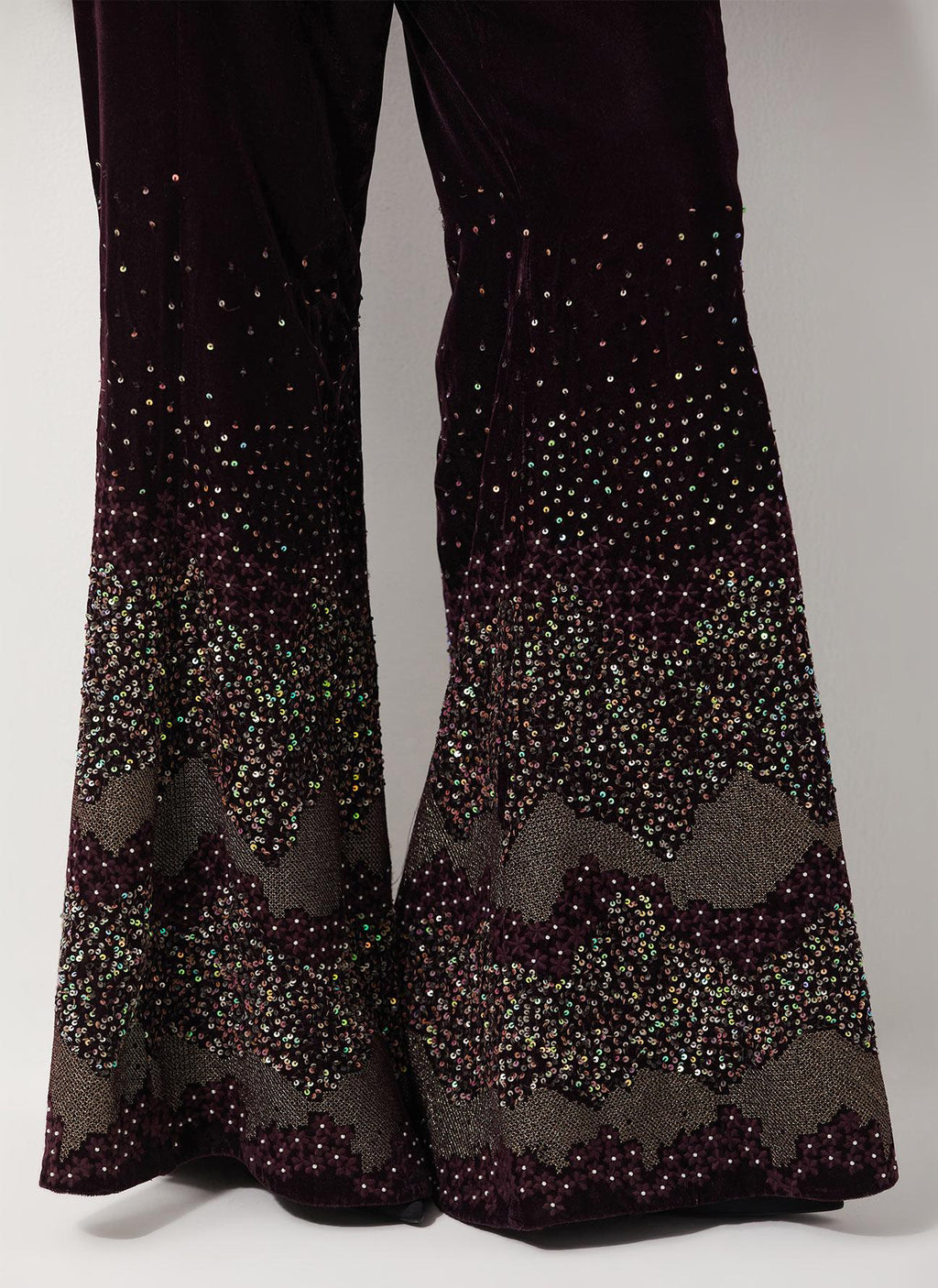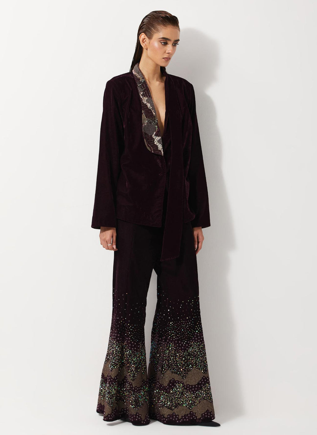 Burgandy Peplum Velvet Jacket Paired With Flared Embroidery Trouser