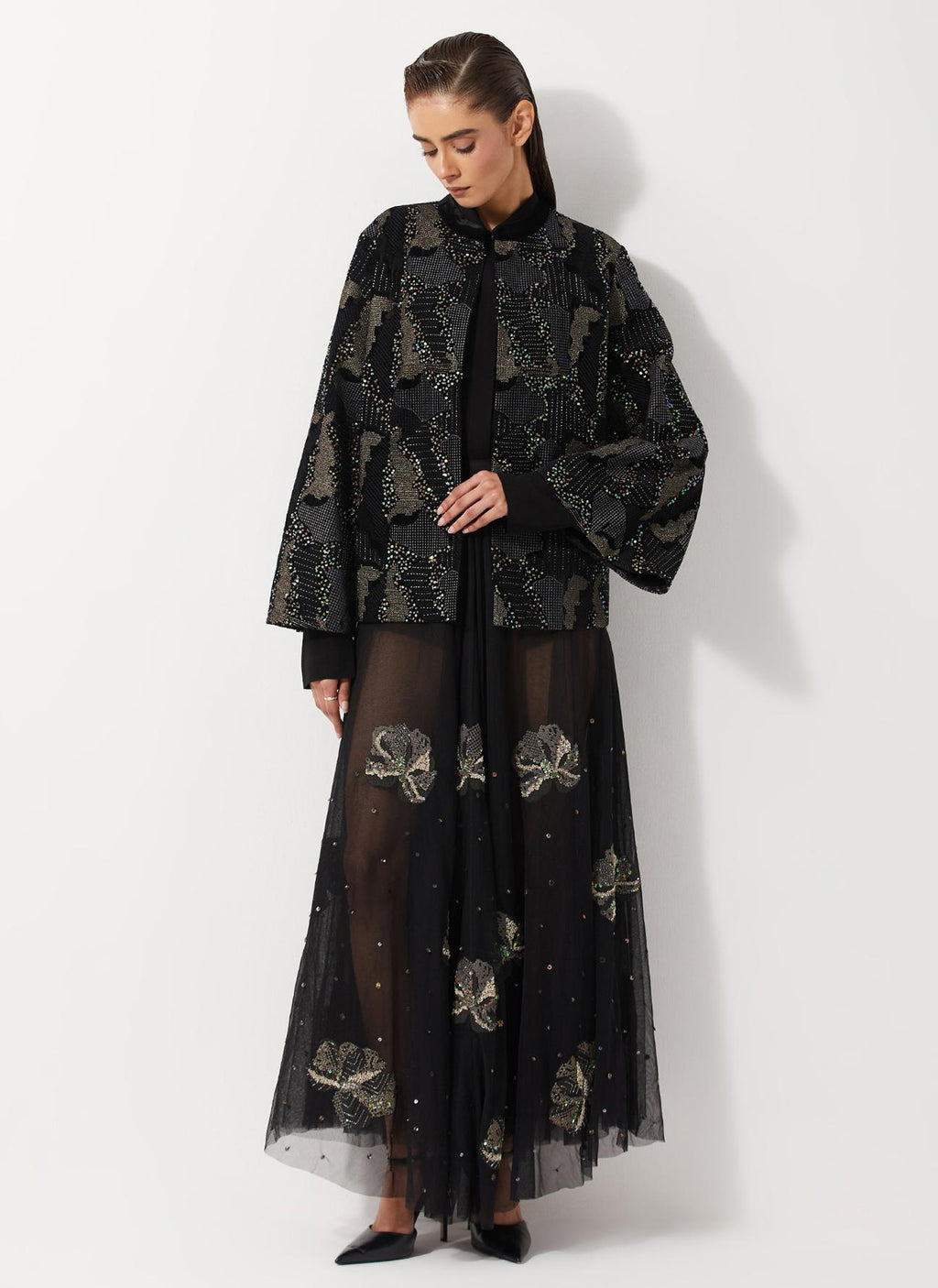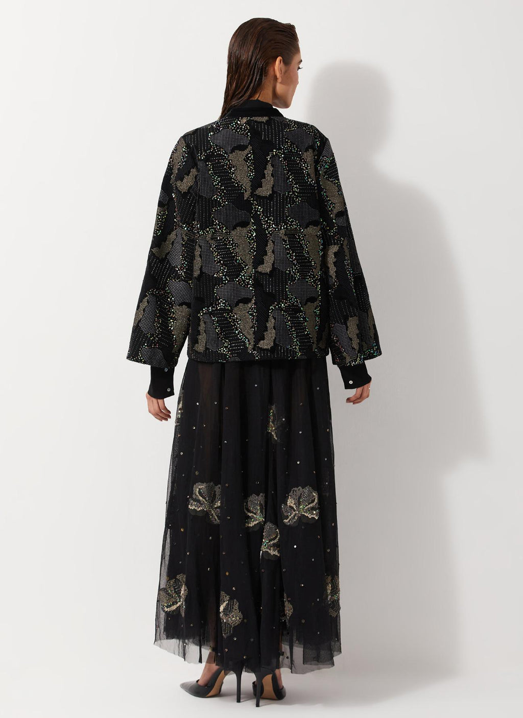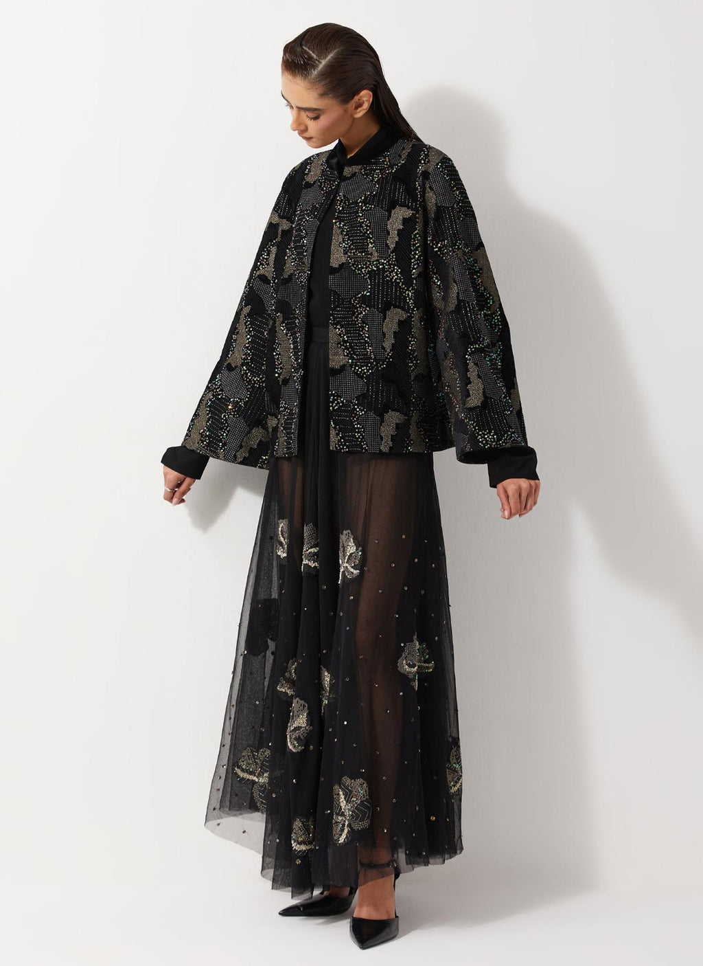 Black All Over Embroidered Jacket In Velvet Paired With Tulle Embellished Skirt