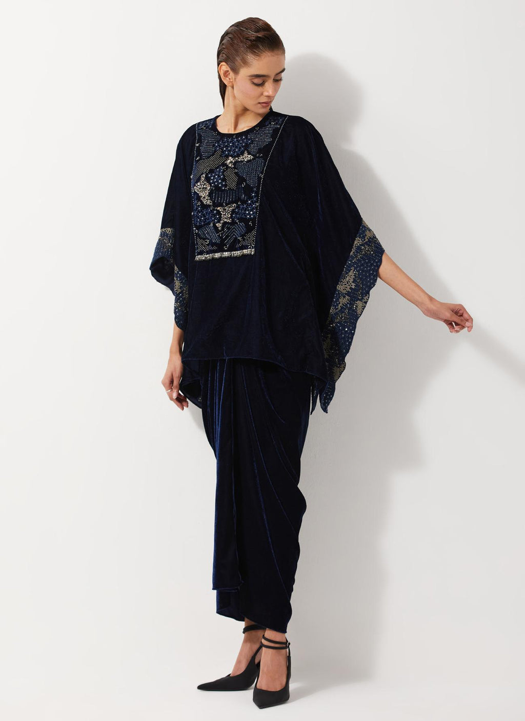 Navy Blue Velvet Embellished Poncho Top Paired With Drape Velvet Skirt