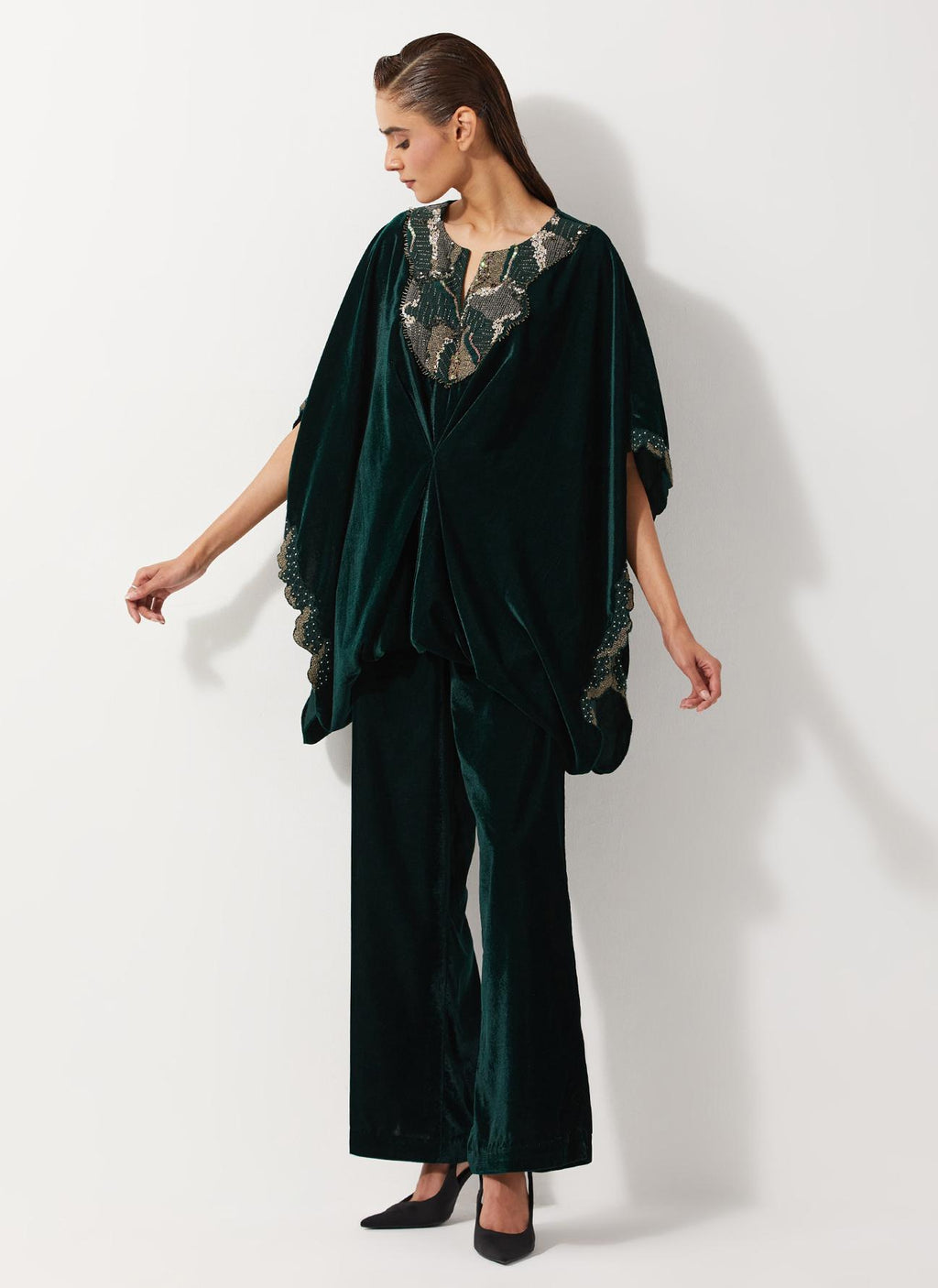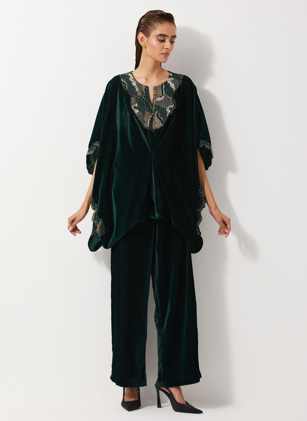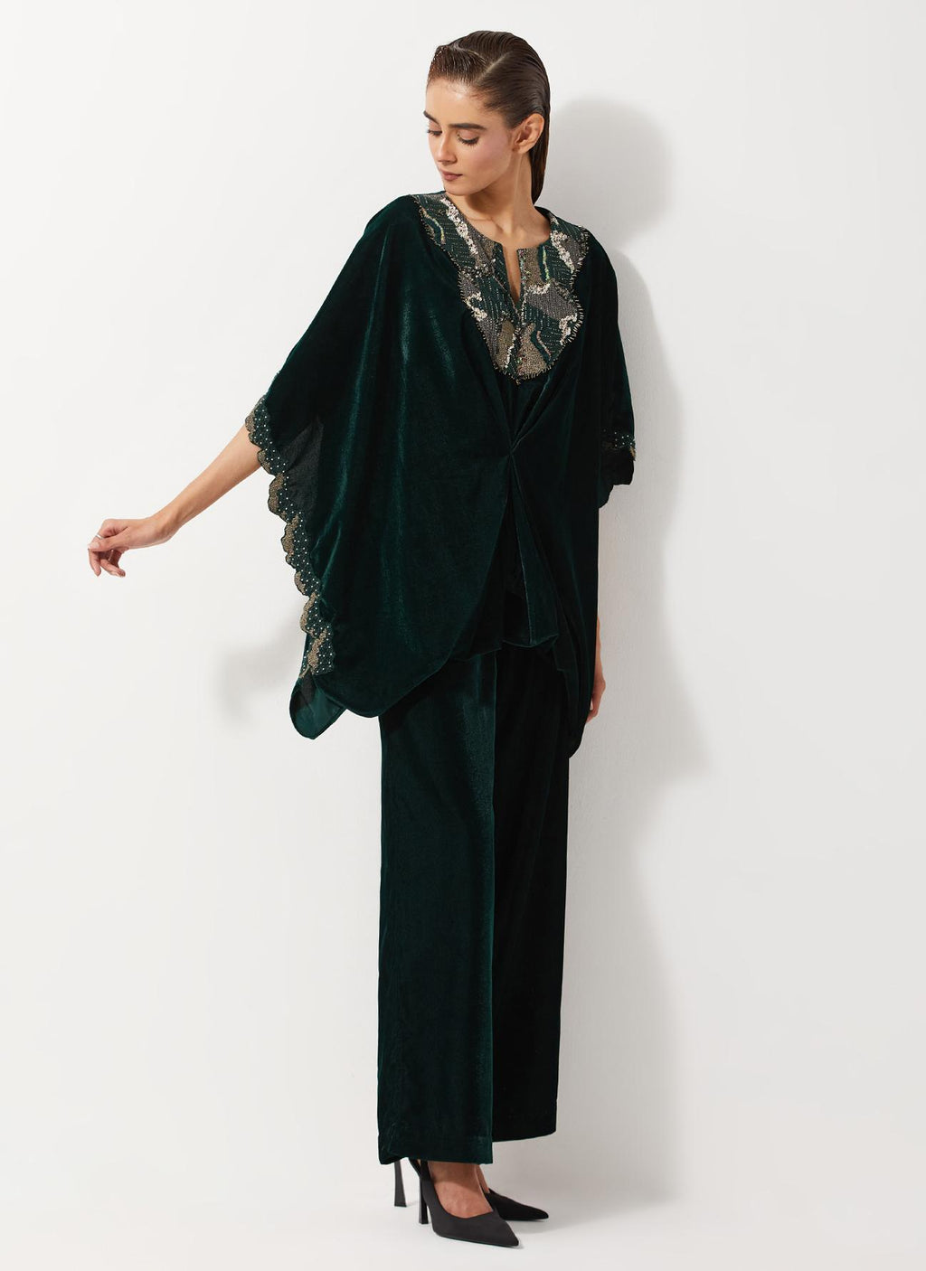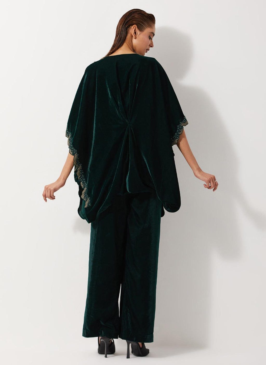 Bottle Green Velvet Embellished Pleated Poncho Top Paired Velvet Straight Pants