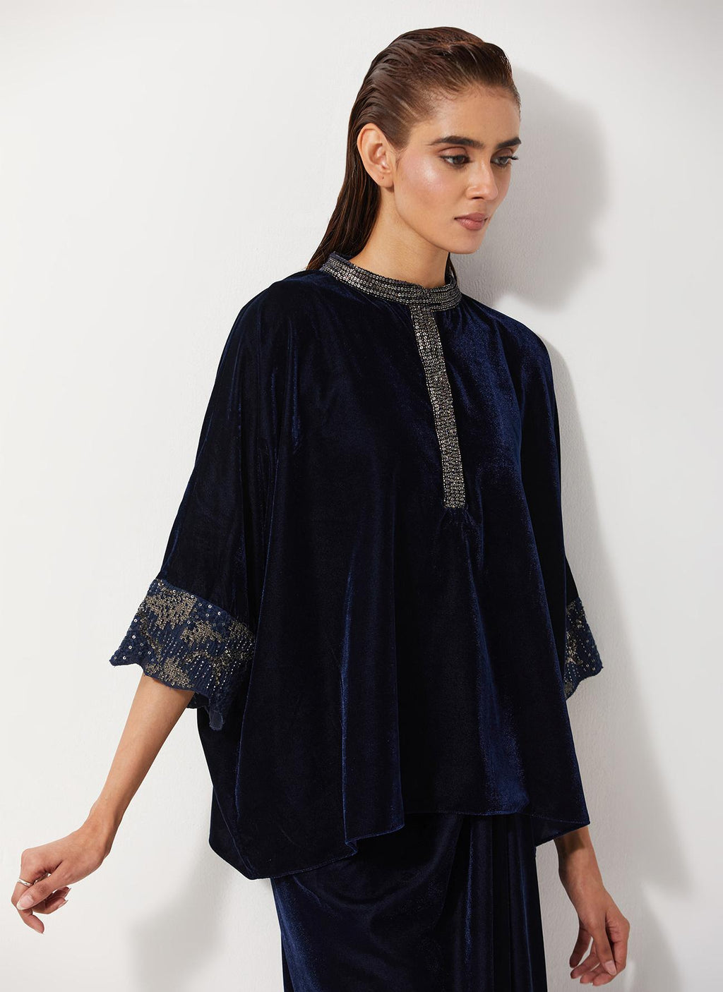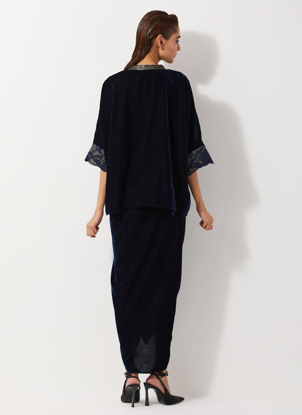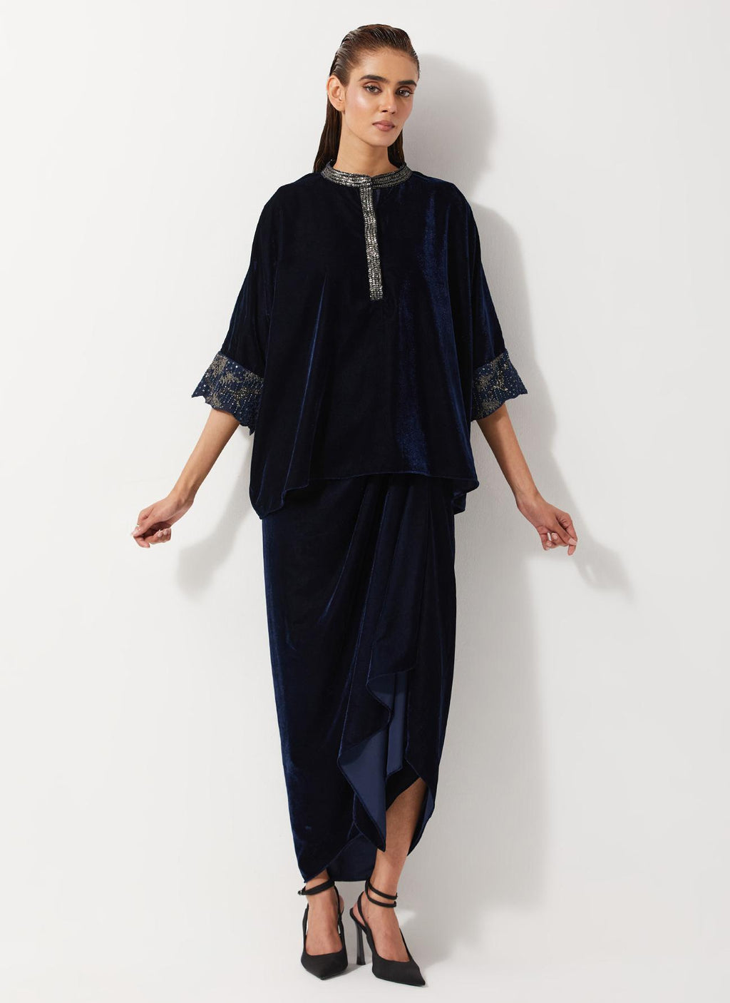 Navy Blue Velvet Baggy Top Paired With Drap Skirt