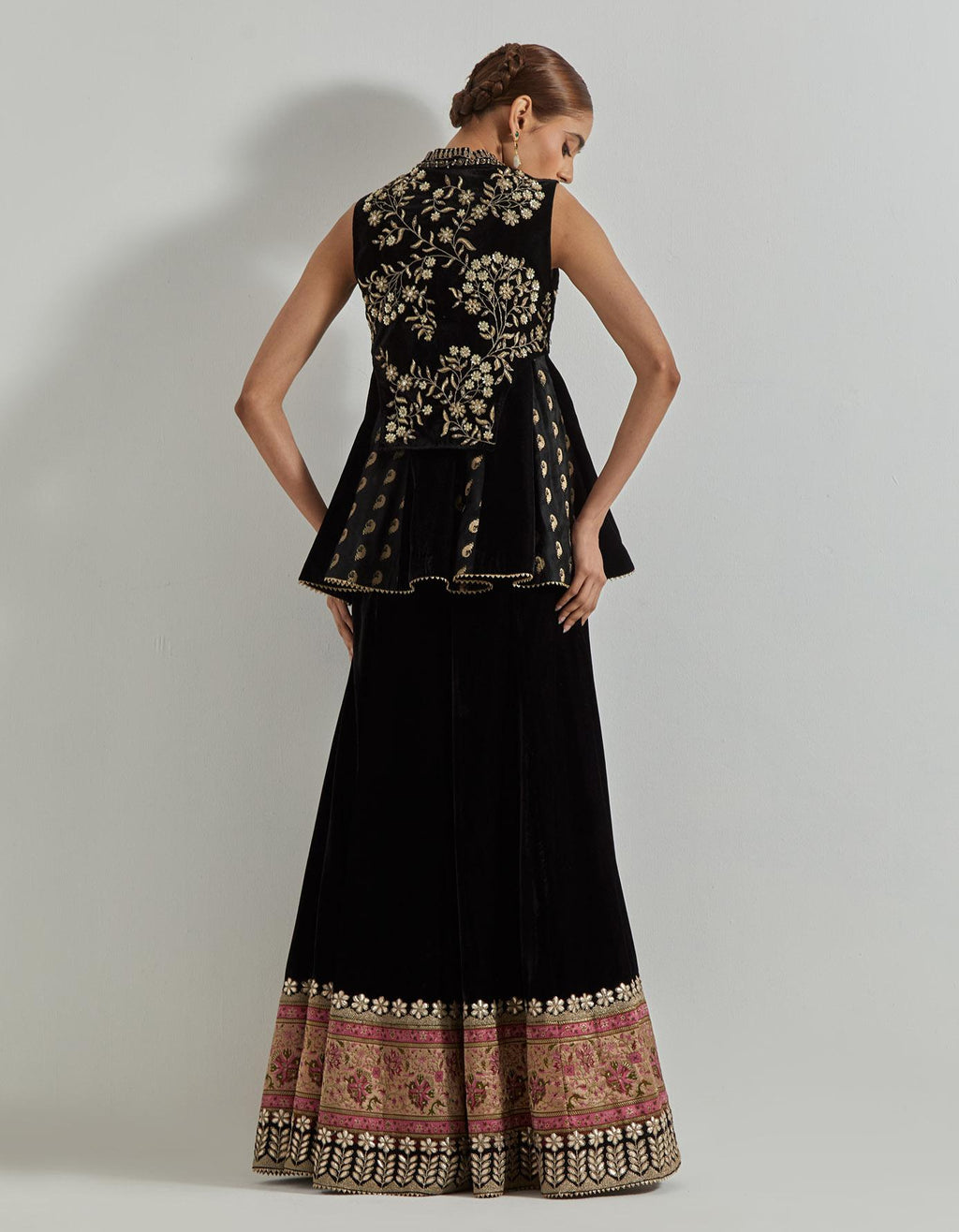• Rangrez Black A Line Jacket Paired With Brocade And Velveet Panelled Skirt
